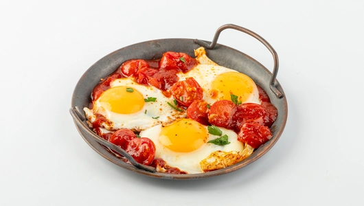 Лучший способ порадовать себя прямо с утра — позавтракать шакшукой, которую мы бережно упакуем в термосумку и привезём горячей! Это израильский вариант яичницы: пряный, ароматный и очень сытный. Блюдо состоит из трёх яиц, обжаренных в пикантном томатном соусе с халапеньо и красным луком.