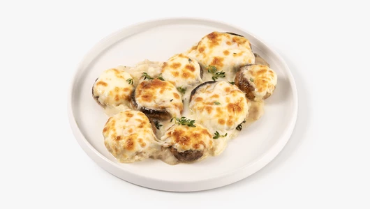 Шляпки упругих шампиньонов наполнены сырной начинкой с чесноком и пармезаном, а затем покрыты сливочным соусом бешамель с мускатным орехом. Моцарелла при запекании плавится, образуя нежную тягучую корочку, а немного свежего тимьяна добавляет лёгкую хвойную нотку. Мы уже подготовили грибы и залили их соусом — вам останется только довести блюдо до румяности в духовке, чтобы бешамель загустел, а сырная начинка стала мягкой и ароматной. Такие грибочки станут тёплой и аппетитной закуской, которая соберёт за одним столом и больших, и маленьких гостей.