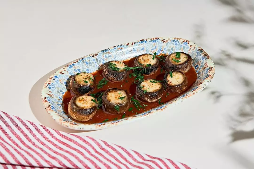 Шампиньоны, фаршированные и запечённые под слоем тягучего сыра сулугуни.