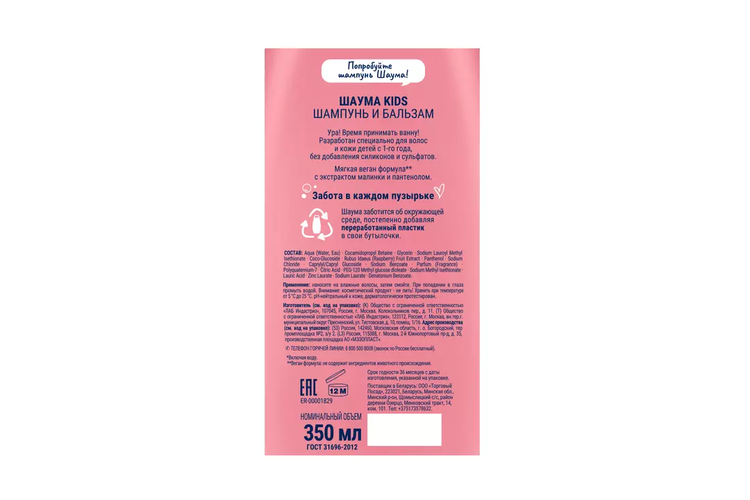 ШАУМА 350 мл Шампунь&Бальзам Нежный и Бережный Уход специально для волос и тела детей для девочек: • нежная и мягкая формула без сульфатов, силиконов и парабенов • облегчает расчесывание волос • 2в1 шампунь и бальзам • с экстрактом малинки • >90% ингредиентов натурального происхождения* • Веган формула** без силиконов • специально для волос и кожи детей *Включая воду **Не содержит ингредиентов животного происхождения Производитель ООО ЛАБ Индастриз. Страна-производитель Россия