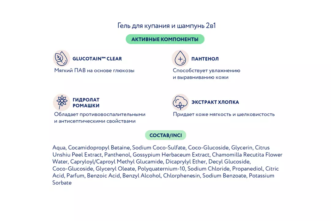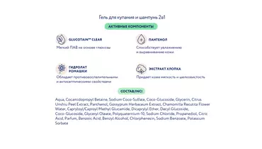 Гель для очень мягкого очищения волос и тела. Поддерживает собственную барьерную функцию эпидермиса, успокаивает чувствительную кожу малышей и взрослых. Подходит для ежедневного использования, не сушит кожу. Идеален для всей семьи. Содержит запатентованный ингредиент натурального происхождения EOSIDIN™, который: • снижает аллергический потенциал • защищает кожу от внешних воздействий • поддерживает естественный иммунитет кожи • обеспечивает мощную поддержку эпидермального барьера на повседневной основе В состав также входят природные компоненты: ГИДРОЛАТ РОМАШКИ (Chamomilla Recutita Flower Water) – обладает противовоспалительными и антисептическими свойствами; GLUCOTAIN CLEAR (Capryloyl/Caproyl Methyl Glucamide) – мягкий ПАВ на основе глюкозы; ПАНТЕНОЛ (Panthenol) – способствует увлажнению и выравниванию кожи; ЭКСТРАКТ ХЛОПКА (Gossypium Herbaceum Extract) – придает коже мягкость и шелковистость. В ПРОДУКТЕ ОТСУТСТВУЮТ: сульфаты, парабены, силиконы, красители, синтетические отдушки и минеральное масло.ю Страна производитель Россия