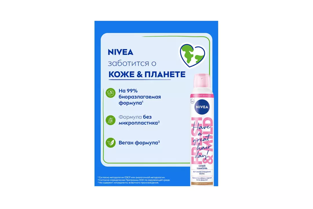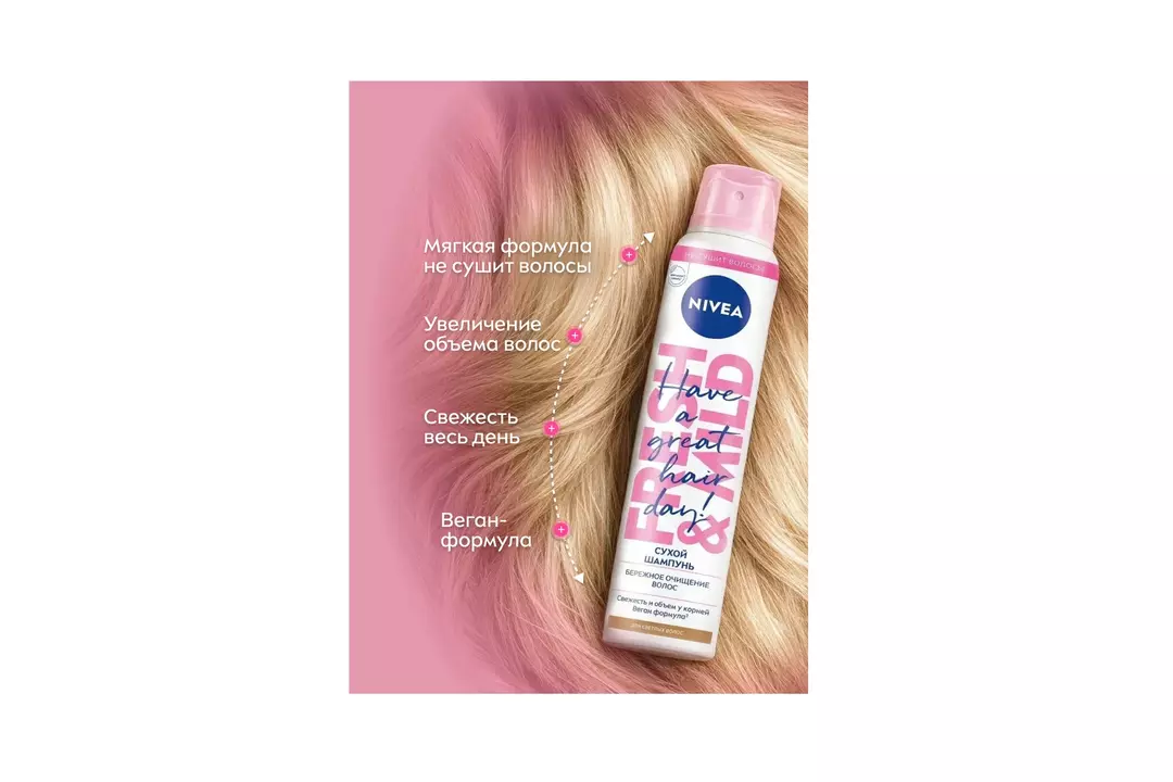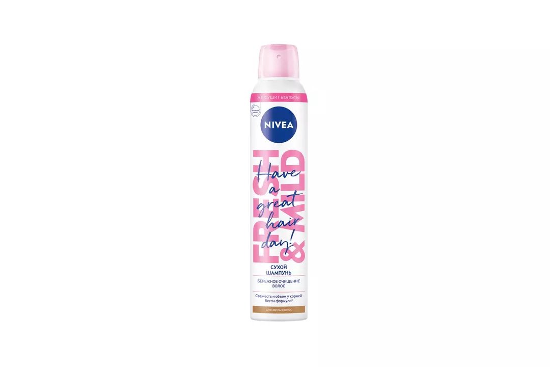 Каждая девушка хоть раз не успевала помыть голову, поэтому вынуждена была прибегать к некоторым хитростям, таким как собрать волосы в хвост или пучок, надеть на голову ленту или другой головной убор. Но эти хитрости, к сожалению, все замечают. Решением проблемы будет сухой шампунь для светлых волос Fresh & Mild от NIVEA. Он мгновенно освежит укладку и сохранит естественный оттенок ваших волос без белого налёта на волосах. Мягкая формула не сушит волосы и дарит волосам легкость и объем. Сухой шампунь идеален для быстрой реанимации образа за считанные минуты. Действуйте в 3х направлениях: мягкое очищение без раздражения кожи головы, увеличение объема волос, свежесть весь день с приятным и легким цитрусово-цветочным ароматом. Подходит для светлых и русых оттенков волос. Способ применения: 1. Энергично встряхнуть, поднять прядь волос и равномерно распылить с расстояния 30 см. 2. Легкими массажными движениями распределить шампунь от корней к кончикам 3. Легкими движениями расчесать волосы, удалив остатки шампуня. Для идеального эффекта подождите немного и слегка высушите феном. • Цветочно-цитрусовый аромат; • Освежит прическу; • Не сушит волосы; • Веган-формула; • Не оставляет белых следов и сохраняет естественный оттенок волос. Страна производитель-Португалия