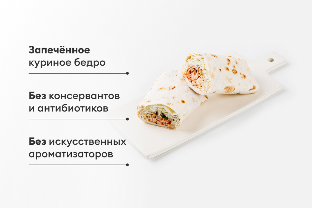 Сочная шаурма с запечёнными куриными бёдрышками. Приготовлена по-грузински: с целым букетом кавказских трав и пикантной аджикой. Завёрнута в тонкий пшеничный лаваш и слегка обжарена на гриле. Пряно и сытно.