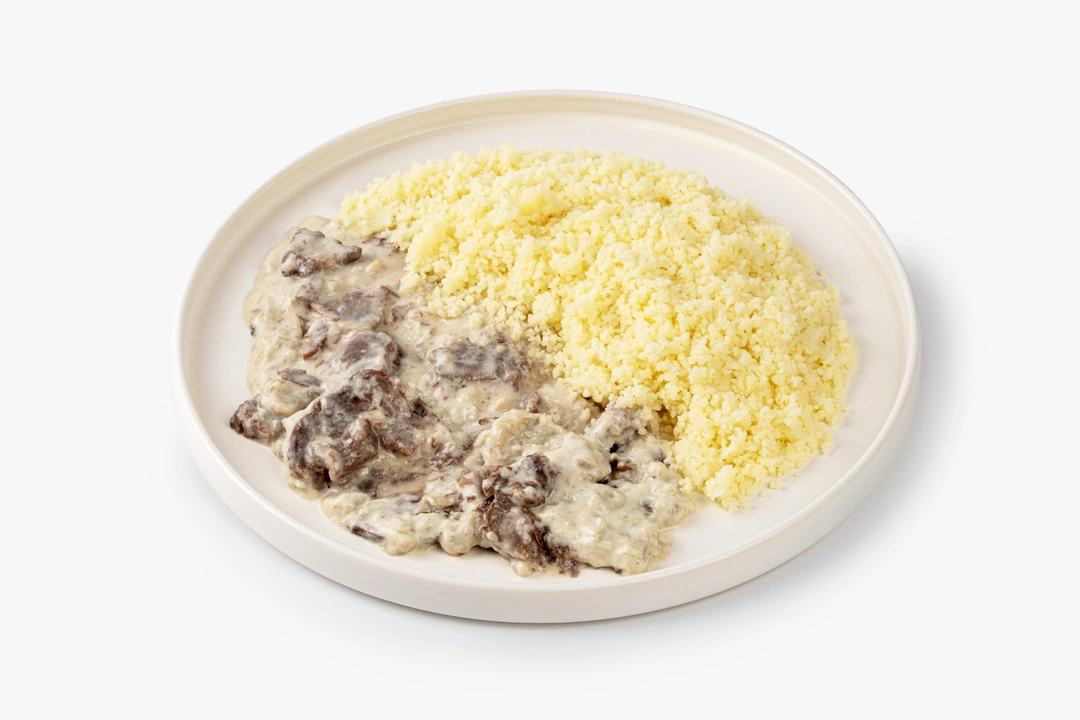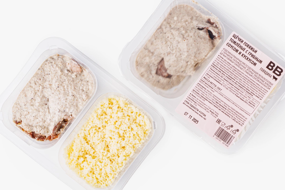 Томлёные говяжьи щёчки — нежное деликатесное блюдо. Соус с белыми грибами и шампиньонами придаёт ему выразительный аромат и лёгкий сливочный оттенок. Мы дополнили его гарниром из кускуса, который благодаря подливе становится особенно мягким и душистым. Разогрейте продукт и подайте его на обед или ужин, по желанию можно добавить рубленую свежую зелень или овощную нарезку. Блюдо позволит вам почувствовать себя гостем шикарного ресторана не выходя из дома.