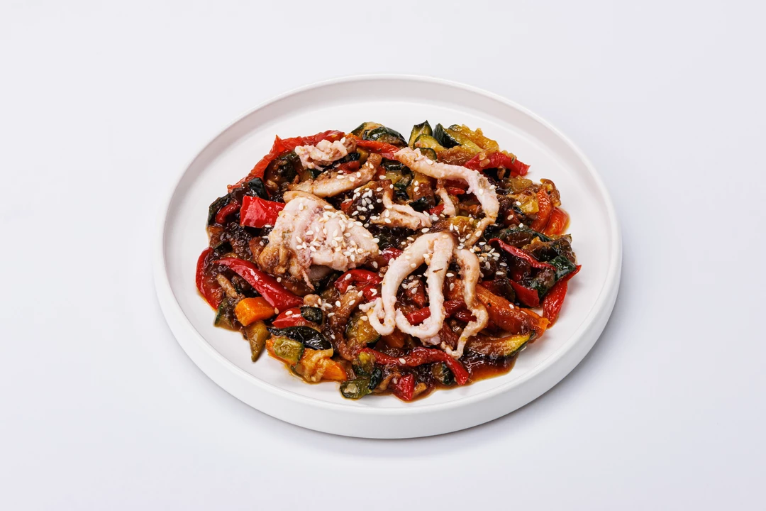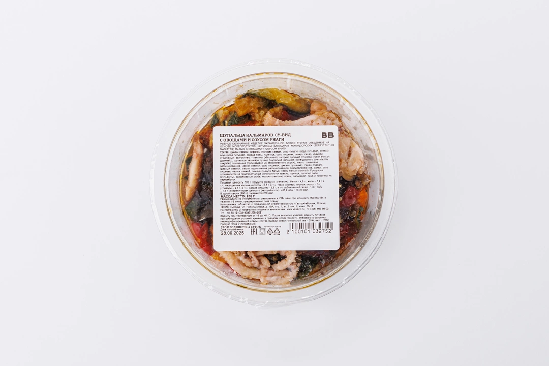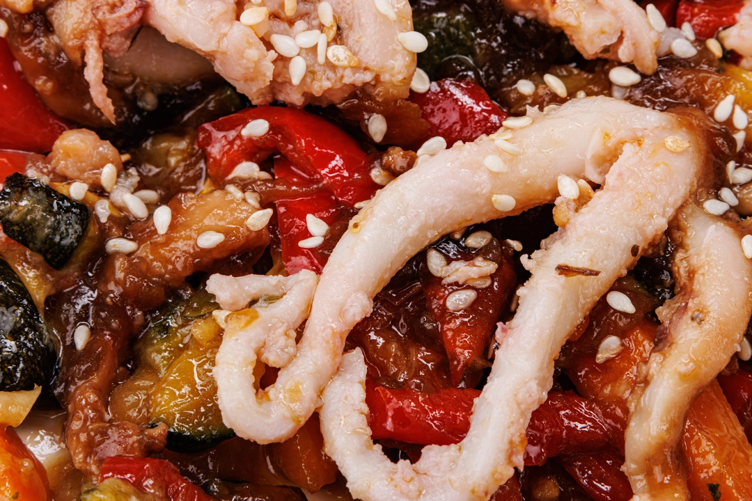 Щупальца кальмаров су-вид с овощами и соусом Унаги