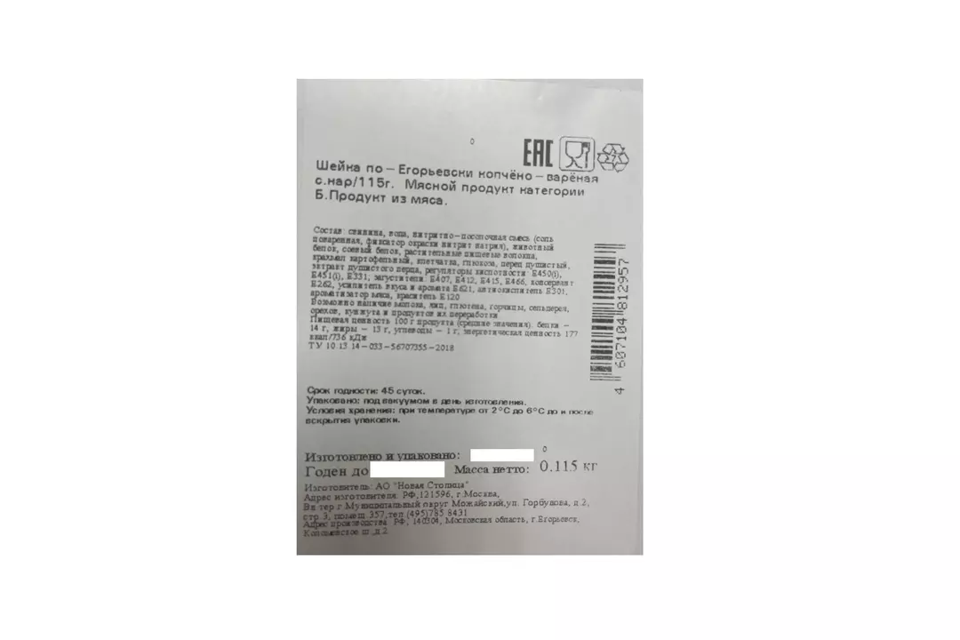 Шейка варёно-копченая Егорьевская ФКГ по-Егорьевски 115 г / Супермаркет
