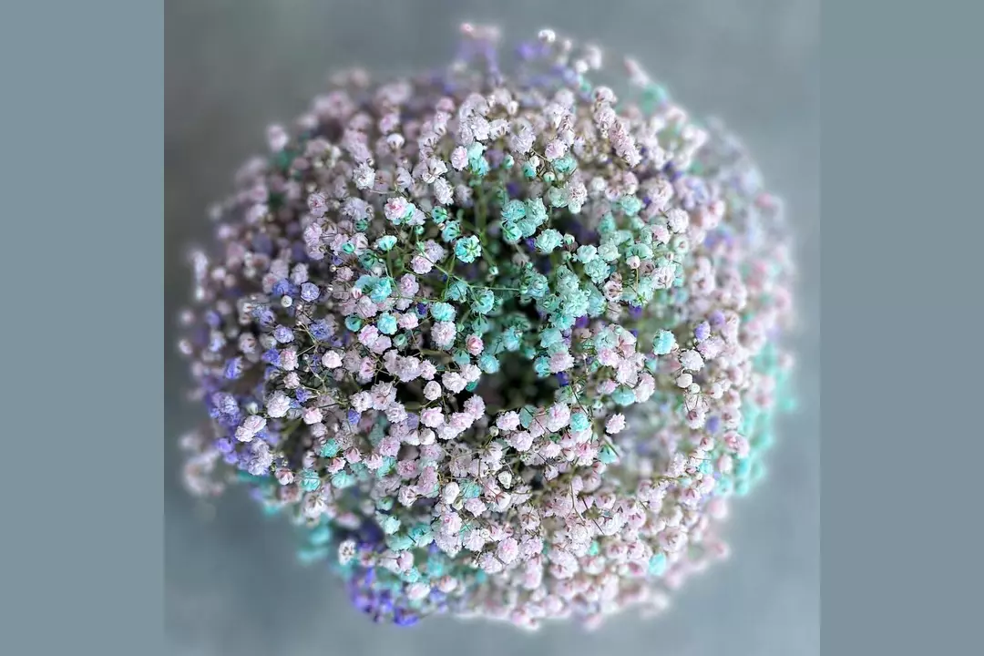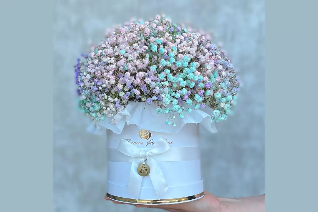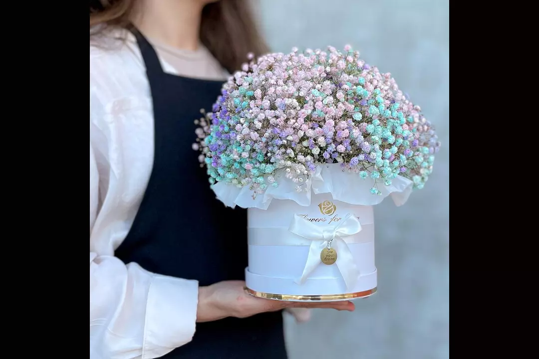 Композиция из радужной гипсофилы в стильной шляпной коробке. Размер L. Диаметр шляпной коробки 15см. Состав: Тишью - 1 шт. Шляпная коробка с лентами - 1 шт. Губка флористическая - 1 шт. гипсофила радужная - 7 шт.
