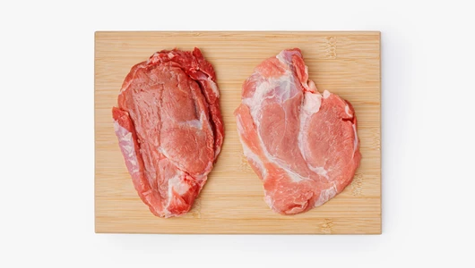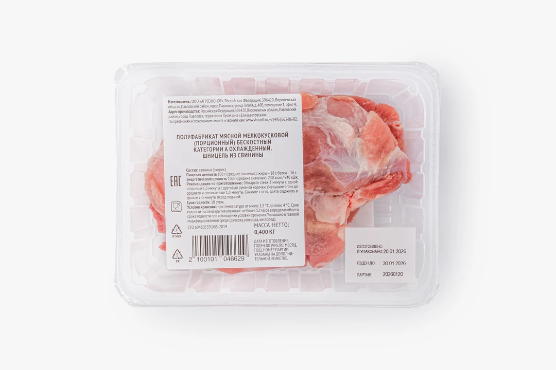 Шницель из свиного окорока с ровной толщиной и плотной, упругой текстурой. Мясо прожаривается равномерно, оставаясь сочным внутри. Нейтральный вкус позволяет использовать разные варианты панировки или готовить без неё, дополняя блюдо соусами и гарнирами. Подойдёт для сковороды, духовки или приготовления в кляре. Продукт охлаждённый, требует термической обработки.