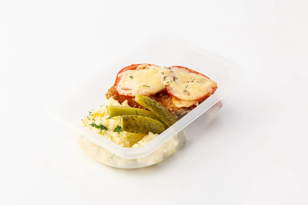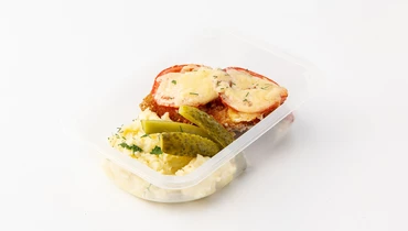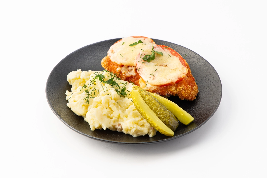 Шницель куриный под сыром с картофельным пюре и маринованными огурцами, кафе