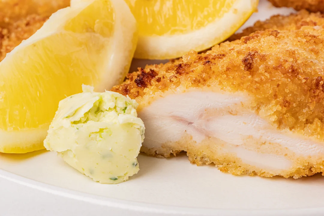 Аппетитный куриный шницель с пряным маслом и лимоном — это готовое решение для ужина без лишних хлопот. Мы отбили филе грудки, обваляли в панировочных сухарях и обжарили до золотистой корочки. Отдельно добавили пряное масло с чесноком и петрушкой — оно придаёт мясу мягкость и аромат. Разогрейте шницель и подавайте его с гарниром, предварительно сбрызнув лимоном и полив маслом. Блюдо особенно понравится поклонникам классической европейской кухни, ведь оно приготовлено по традиционному венскому рецепту