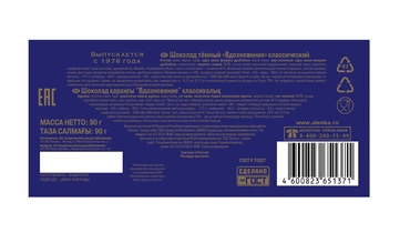 Классический шоколад «Вдохновение», созданный по оригинальной рецептуре 1976 года, с дроблеными ядрами жареного фундука. Насыщенный вкус какао, благородная горчинка с тонкими нотками жареных орехов. Тающая текстура и россыпь хрустящих ореховых осколков. Изысканное послевкусие и традиционная форма тонких палочек в серебристой фольге. Страна производитель-Россия