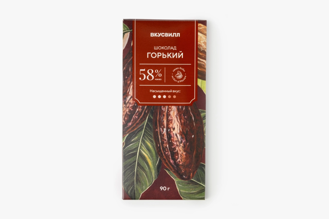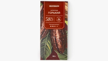 Горький шоколад с мягким, но выразительным вкусом, заметной какао-горчинкой и умеренной сладостью. Какао-тёртое даёт насыщенную шоколадную глубину, а какао-масло создаёт гладкую, тающую структуру. Какао-порошок добавляет плотность и бархатистость, а сахар смягчает горечь. Шоколад легко ломается на аккуратные дольки. Подойдёт тем, кто любит насыщенный, но не слишком горький шоколад с приятной сладостью и долгим послевкусием. Содержит 58% какао.
