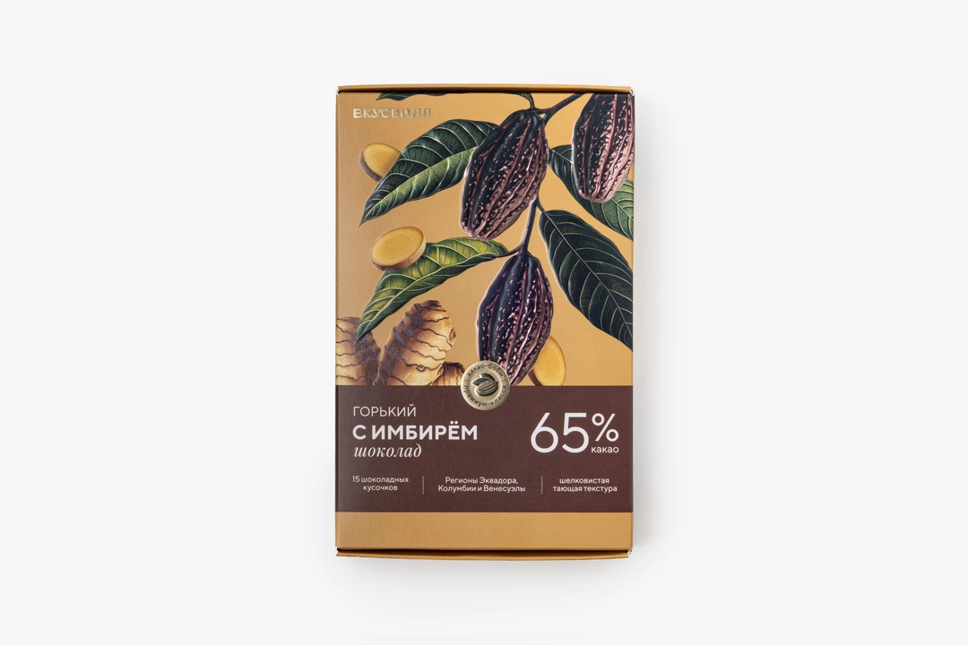 Горький шоколад (65 % какао) изготовлен на основе какао-продуктов Fino de Aroma из смеси изысканных ароматических какао-бобов криолло и тринитарио. Эти сорта обладают насыщенным и в то же время тонким шоколадным вкусом с мягкой горчинкой. Цветочные, фруктовые, ореховые ноты придают горькому шоколаду уникальный вкус и аромат. Сырьем для экстракта имбиря служит корень имбиря, полученный методом холодной фракции. В имбире содержится несколько разновидностей эфирных масле, повышающих иммунитет и благотворно влияющих на организм человека в целом.