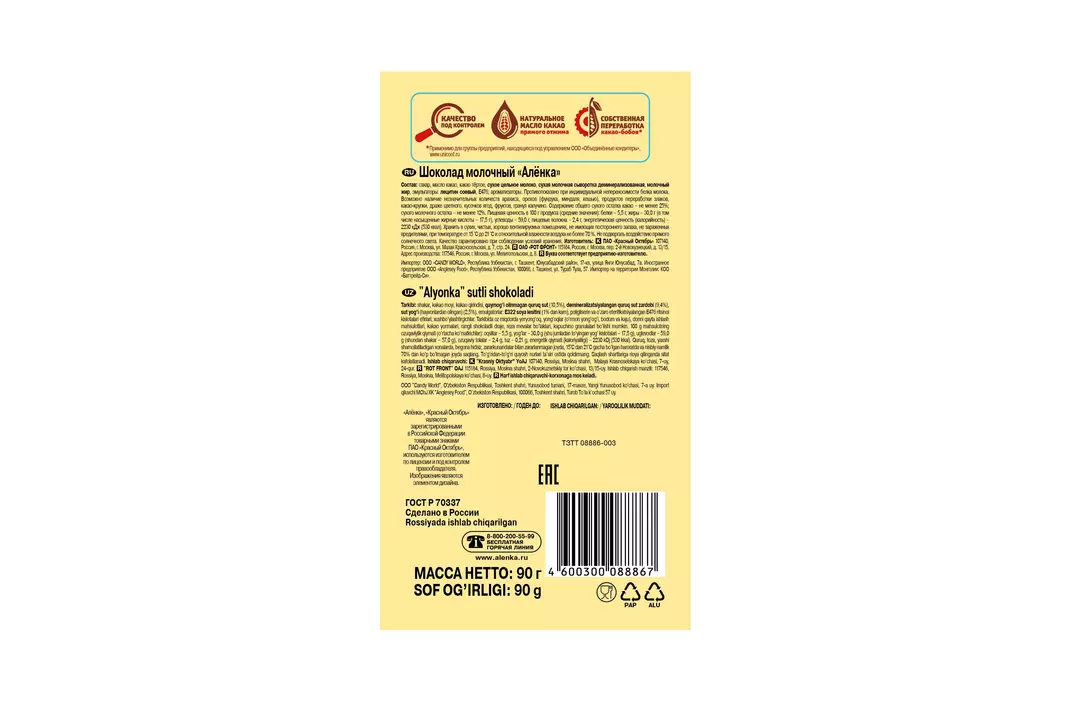 Классический молочный шоколад «Алёнка» – нежный вкус, знакомый с детства. Неизменный с 1966 года рецепт, классическая, знаменитая на весь мир обертка с изображением голубоглазой девочки – этот шоколад неизменно вызывает теплые ностальгические чувства. Плотная ломкая текстура плитки, тающий сливочно-шоколадный вкус, насыщенный аромат – та самая шоколадка «Алёнка», гордость фабрики «Красный Октябрь»! Страна-производитель Россия