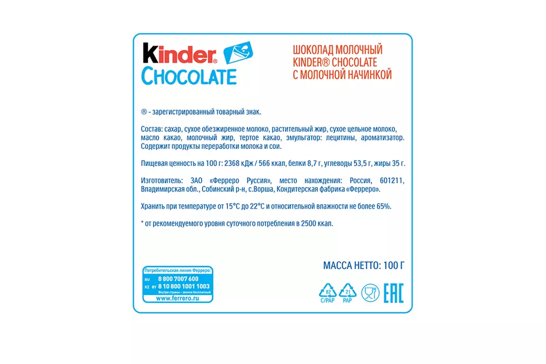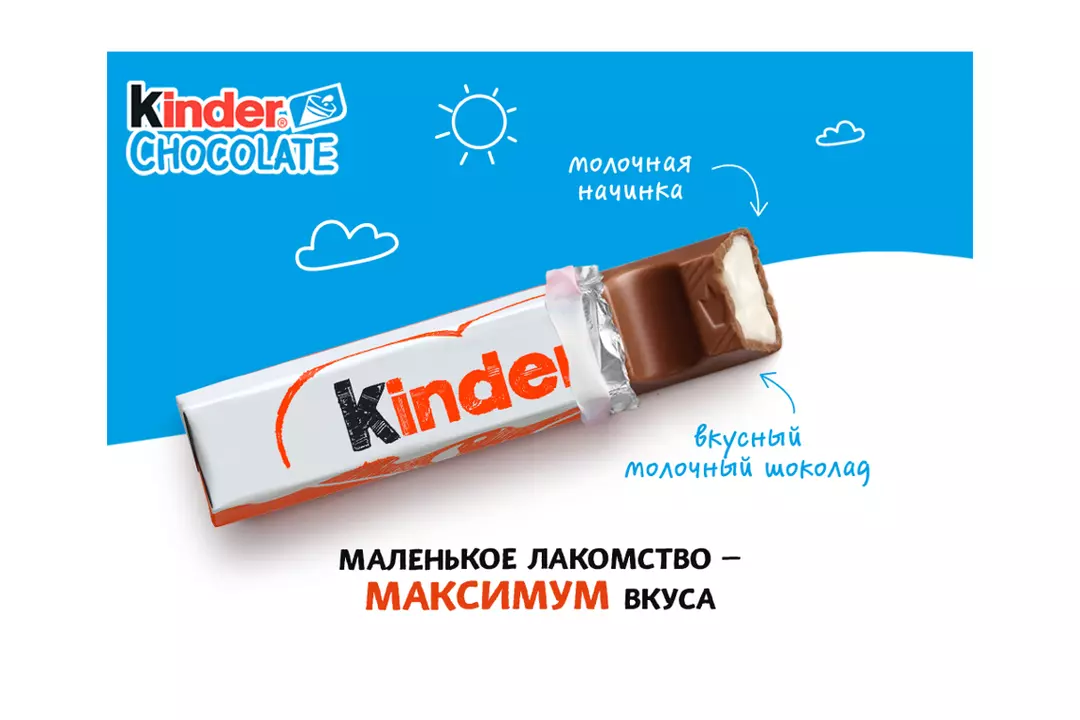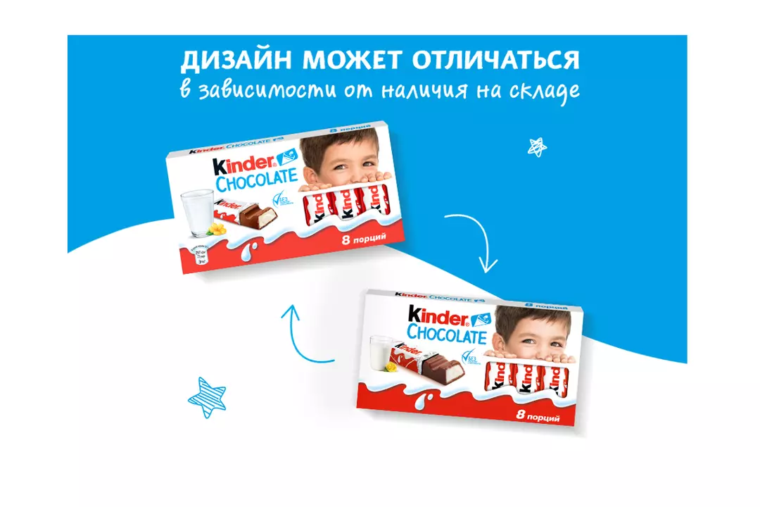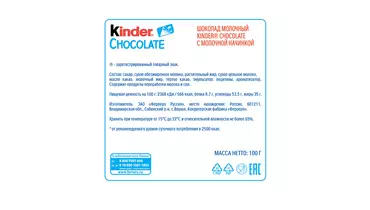 Kinder® Шоколад - это нежная молочная начинка и вкусный молочный шоколад. Уникальный рецепт идеально подходят для детей, когда им хочется сладкого! А благодаря индивидуально упакованым порциям, мамы могут с лёгкостью контролировать потребление шоколада детьми. Хранить при температуре от 15°C до 22°C и относительной влажности не более 65%. Страна-производитель Россия