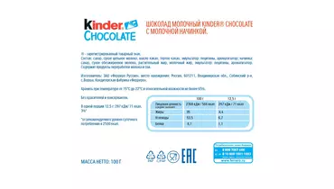 Kinder® Шоколад - это нежная молочная начинка и вкусный молочный шоколад. Уникальный рецепт идеально подходят для детей, когда им хочется сладкого! А благодаря индивидуально упакованым порциям, мамы могут с лёгкостью контролировать потребление шоколада детьми. В условиях хранения указать - Хранить при температуре от 15°C до 22°C и относительной влажности не более 65%. Страна производитель-Россия