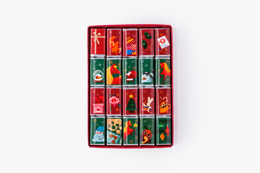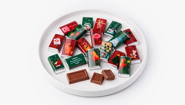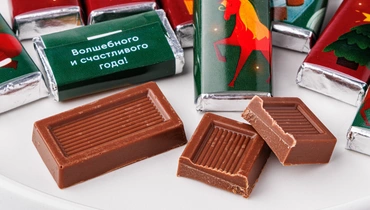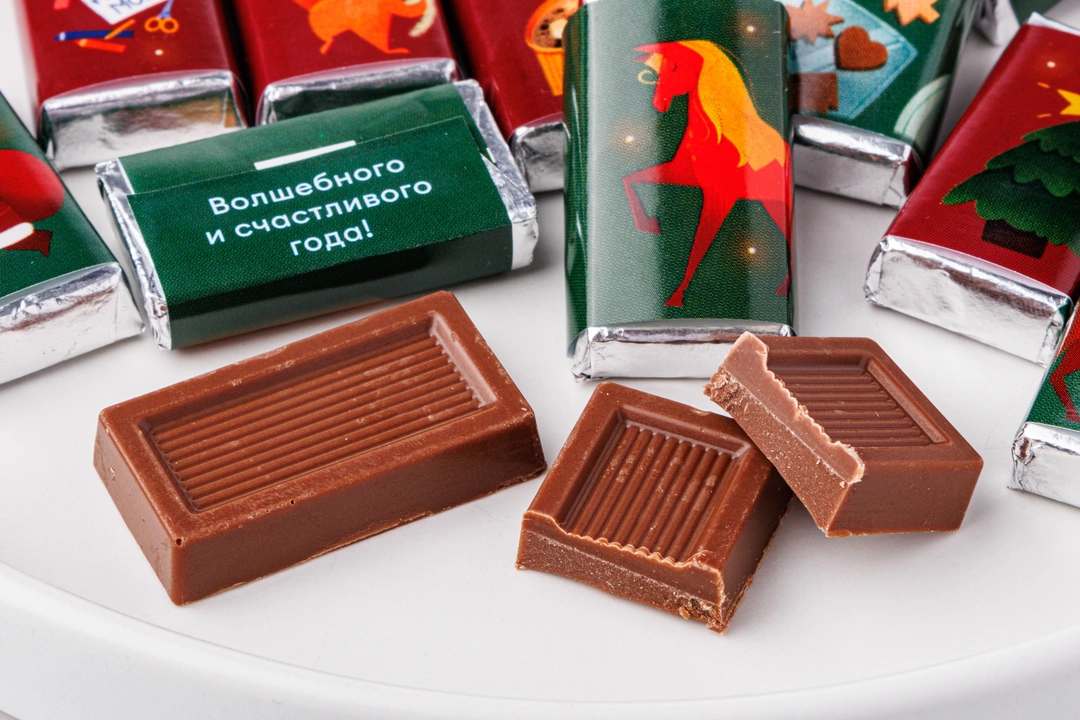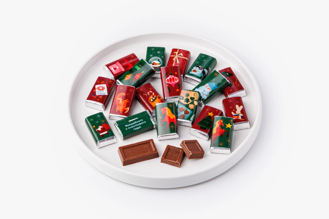 Молочный шоколад в удобном формате: 20 плиток по 5 грамм. Он приготовлен из какао-масла и тёртых бобов с добавлением молока и экстракта ванили. В составе нет искусственных ароматизаторов и усилителей вкуса, поэтому продукт оценят любители натуральных сладостей. На обратной стороне каждой обёртки вы найдёте милое новогоднее пожелание. Такой набор приятно подарить не только близкому человеку, но и самому себе, ведь лакомство создаст праздничную атмосферу и зарядит хорошим настроением.