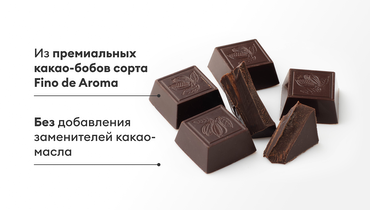 Горький шоколад приготовили из редких какао-бобов премиум-класса Fino de Aroma с добавлением тростникового сахара и натуральной стручковой ванили. Делаем его на ремесленном оборудовании