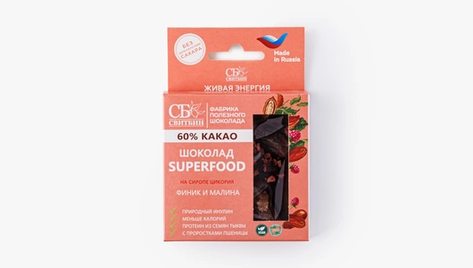 Шоколад для здорового питания изготовлен из натуральных ингредиентов без добавления сахара. Сироп цикория содержит большое количество природного инулина и пищевых волокон и рекомендован, как общеукрепляющее средство, положительно влияющее на работоспособность, переносимость физических и умственных нагрузок. Витграсс (проростки пшеницы) полезен для нормального пищеварения и относится к суперфудам.