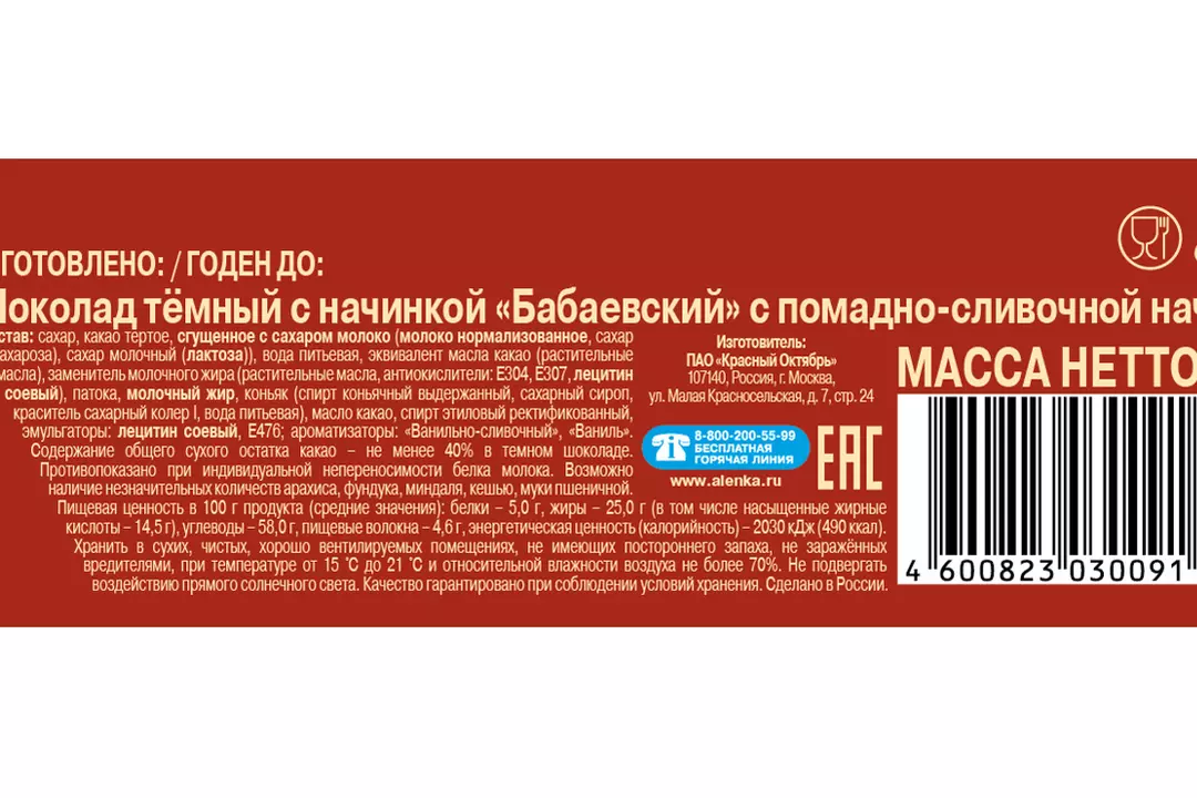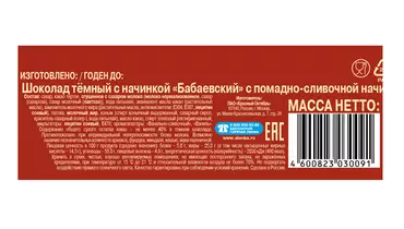 Батончик «Бабаевский» сочетает в себе твердость настоящего темного шоколада и нежность помадно-сливочной начинки. Толстый слой классического шоколада «Бабаевский» с характерным печатным орнаментом скрывает тающую, почти текучую начинку с тонким сливочно-ванильным вкусом. Хороши и к чаю, и просто так. Страна-производитель Россия