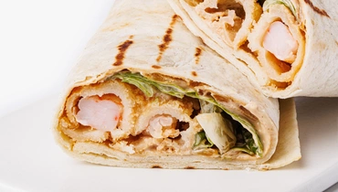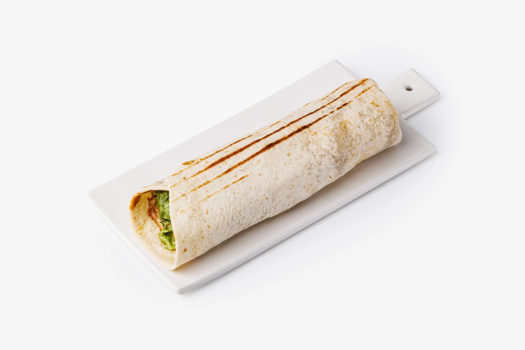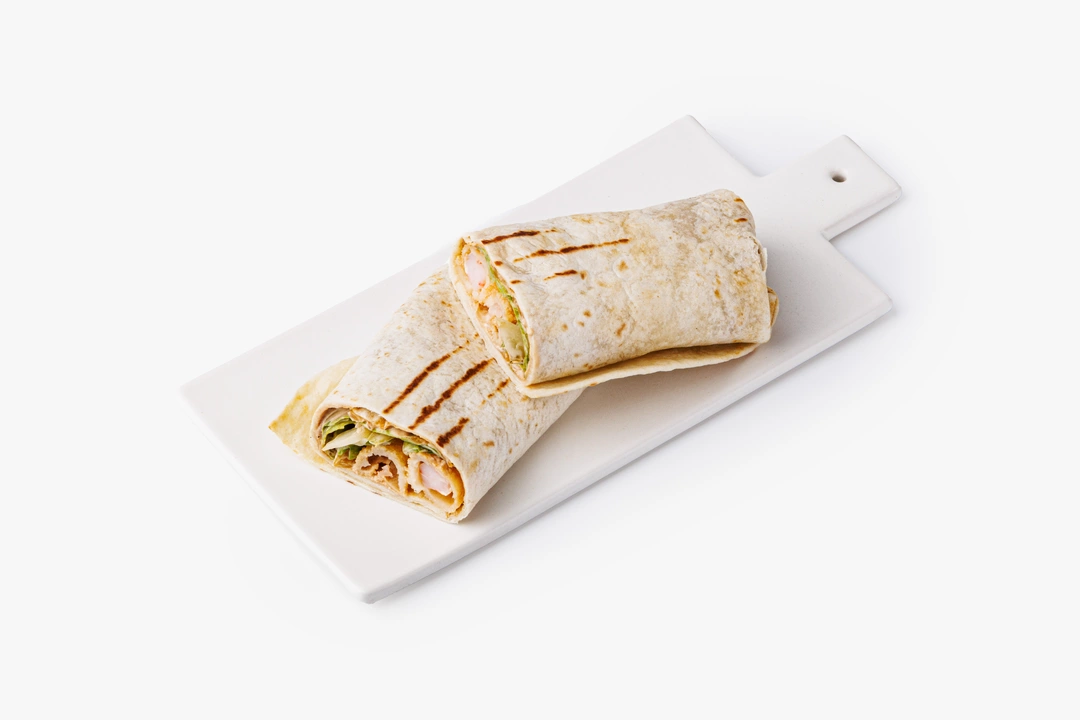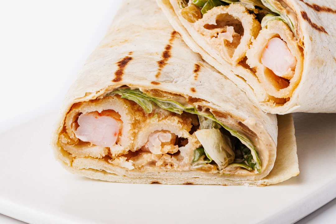 Мягкая тортилья с румяными креветками в хрустящей панировке — перекус, который точно не оставит равнодушным. В качестве компании морепродуктам мы добавили свежий салат айсберг, немного сладковатый лук и пикантный кунжутный соус с лёгкой ореховой ноткой. Сочетание получается сбалансированным: тонкая лепёшка, аппетитная креветка, хрустящие овощи и яркий соус дополняют друг друга и создают насыщенный, но не тяжёлый вкус. Подойдёт на тот случай, когда вам хочется перекусить роллом, начинка которого интереснее, чем просто мясная или куриная. Наш вариант с креветками станет удачной альтернативой — он более лёгкий, при этом свежий и необычный, с изысканным акцентом на морепродуктах.