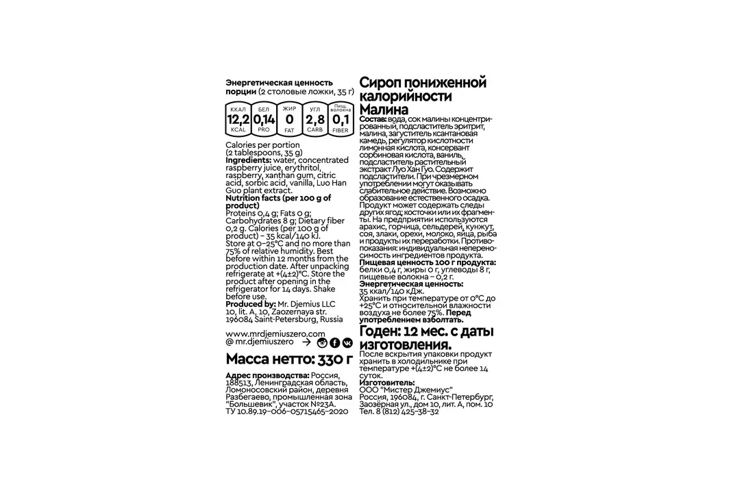 Сироп Mr. Djemius Zero Малина пониженной калорийности 330 г / Супермаркет