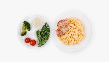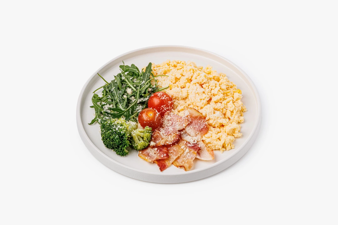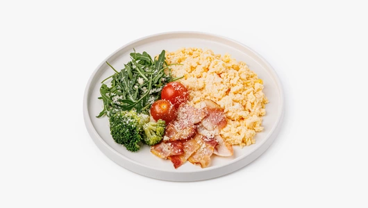 Скрэмбл — это яичница-болтунья, которую мы готовим по традиционному рецепту с обжаренным беконом и свежими овощами. Яичная смесь с хрустящей свиной грудинкой, черри и отварной брокколи дополнена тёртым пармезаном и листьями руколы. Это блюдо — один из любимых и популярных завтраков в европейских кафе. Сочетание яичницы и бекона считается классическим, оно сытное, ароматное и пробуждает аппетит ранним утром.