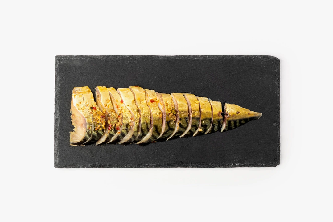 Ароматная скумбрия с кожей, подкопчённая на древесной щепе и приправленная сладким перцем с чесночком. Используем только натуральное мягкое копчение, поэтому дымные ноты деликатно подчёркивают вкус. Аккуратные ломтики удобно положить на бутерброд или подать с молодым отварным картофелем.