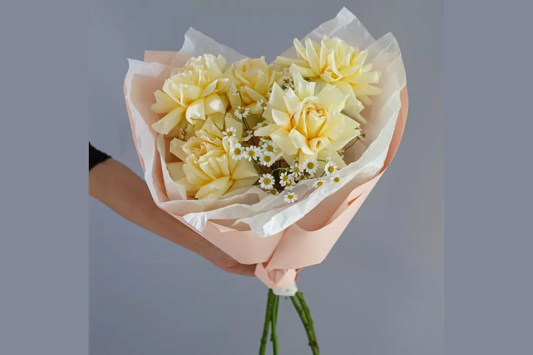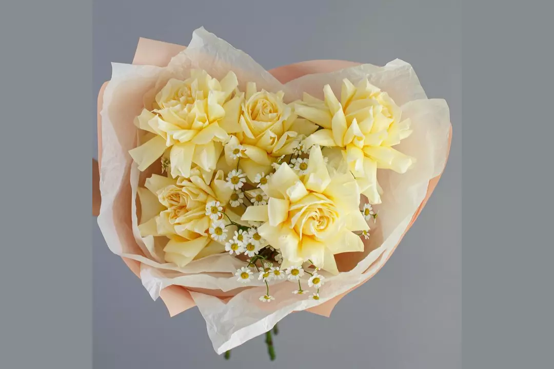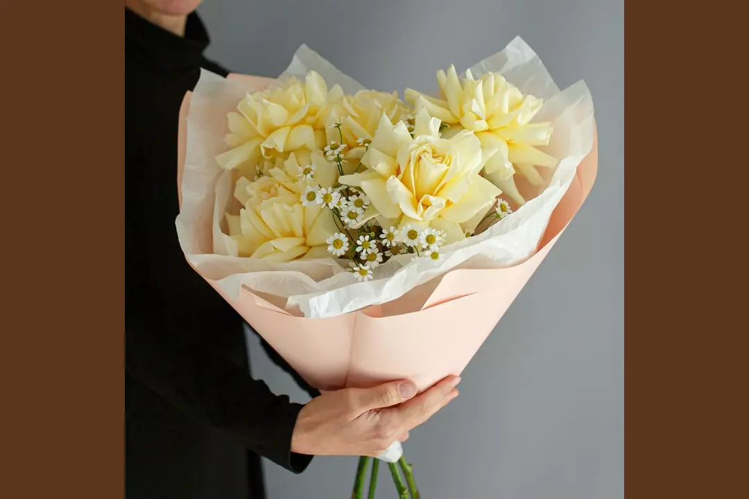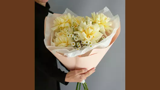 Эффектный букет для самого дорогого человека. Кремовый цвет роз подойдет для любого повода. Французские вывернутые розы в букете, в среднем, стоят около 3 дней, многое зависит от ухода и температурного режима в помещении. Состав: Тишью - 1 шт. Ромашка кустовая - 1 шт. Роза французская - 5 шт. Корейская пленка - 1 шт.