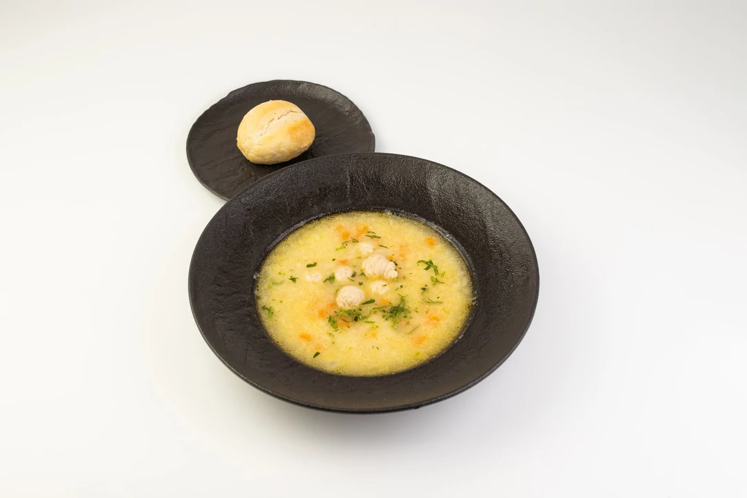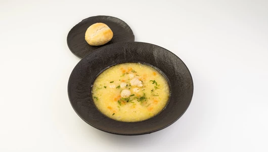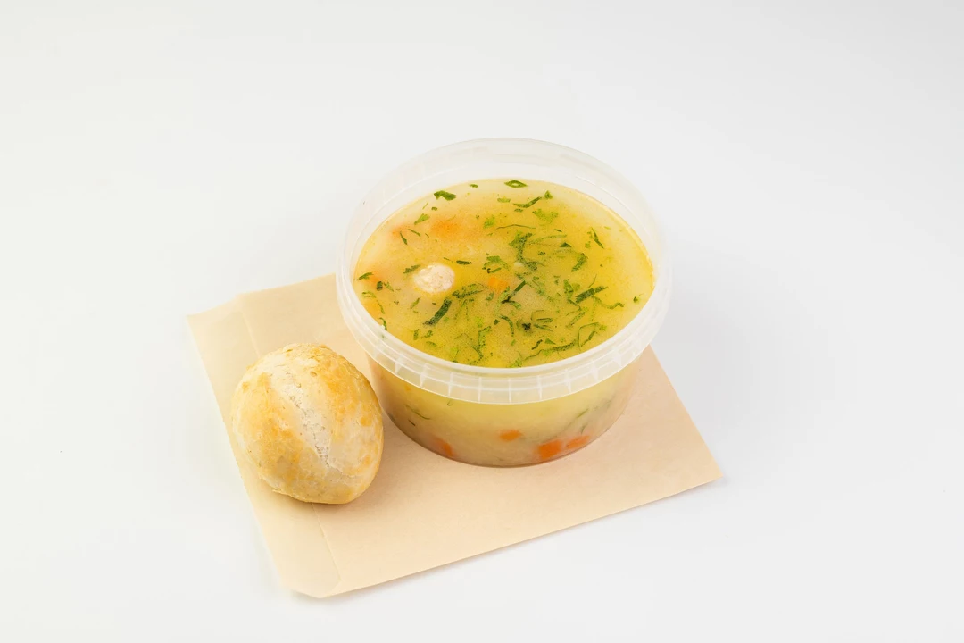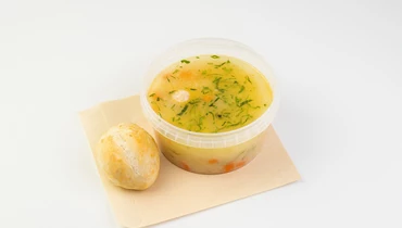 Нежный куриный суп с сочными фрикадельками, картофелем, сладкой морковью, репчатым луком и свежей зеленью петрушки, с добавлением бархатистых сливок. Комплектуется с пшеничной булочкой.