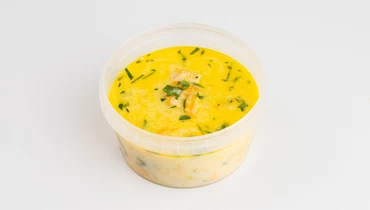 Нежный куриный суп с сочными фрикадельками, картофелем, сладкой морковью, репчатым луком и свежей зеленью петрушки, с добавлением бархатистых сливок.