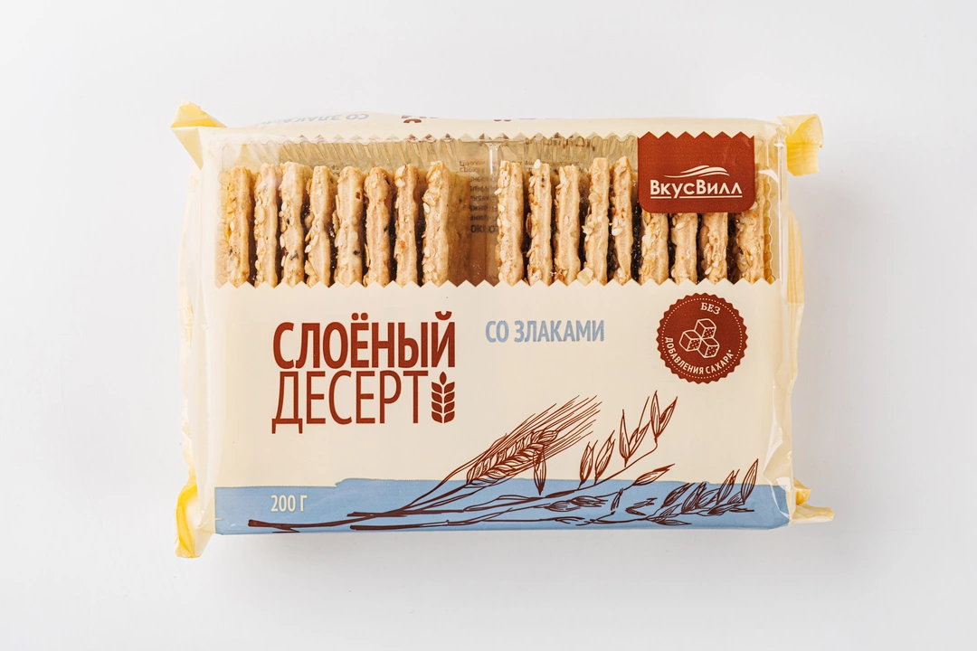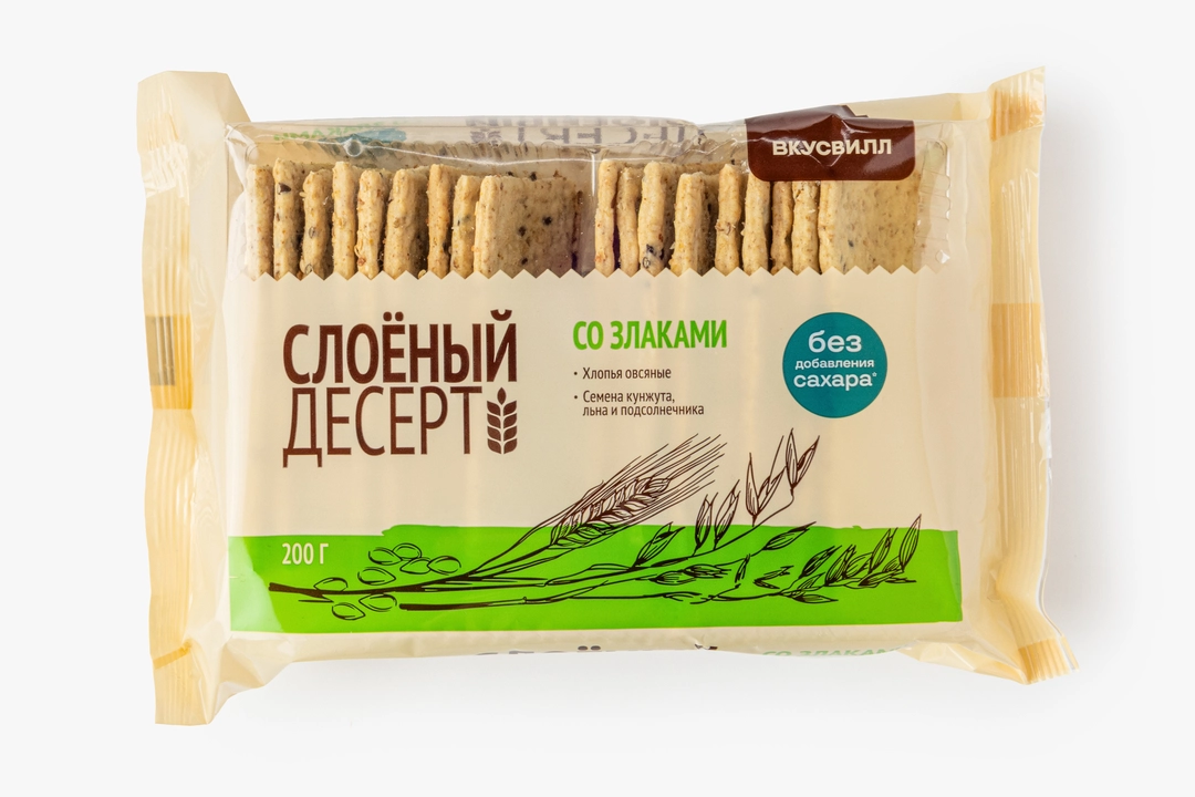 Хрустящее слоёное печенье, изготовленное на сливочном масле, без сахара и подсластителей. Овсяные хлопья, кунжутные, льняные и подсолнечные семечки делают вкус насыщенным и богатым, а также повышают пищевую ценность продукта. Слоёный десерт отлично подойдёт для перекуса и чаепития.