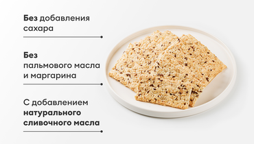Хрустящий десерт приготовлен на сливочном масле, без сахара и подсластителей. С добавлением семян кунжута, льна, подсолнечника и овсяных хлопьев