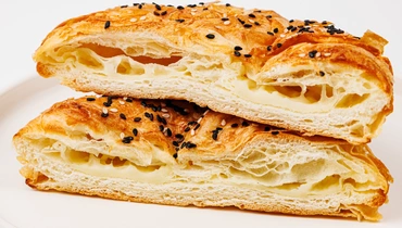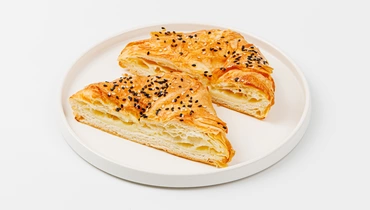 Булочка из слоёного теста с хрустящей корочкой и начинкой из сулугуни. Сыр плавится, но не растекается, сохраняя упругую текстуру и характерную солоноватость. Тесто получается воздушным благодаря сливочному маслу в составе, а молочная основа делает его мягким и нежным. Посыпка из кунжута добавляет лёгкий ореховый привкус. Продукт удобно взять с собой для быстрого перекуса. Подходит для употребления как в тёплом, так и в холодном виде.