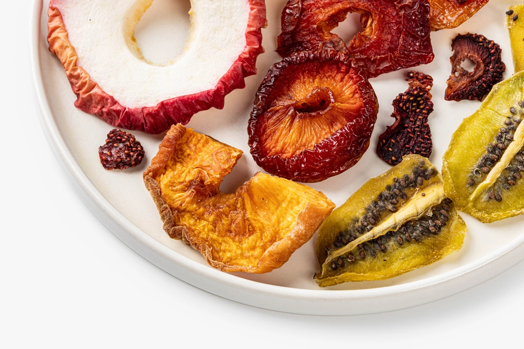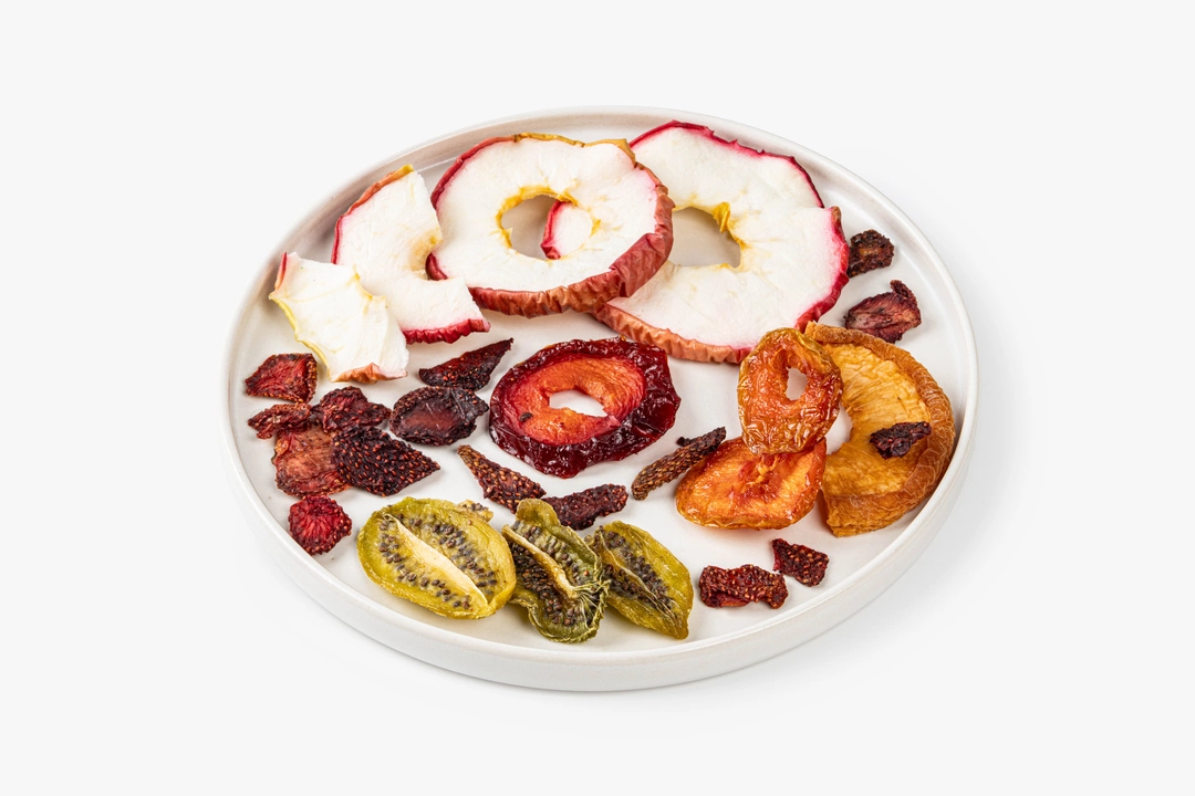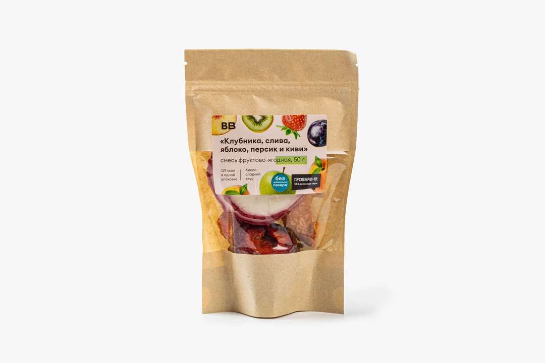 Яркая смесь сушёных фруктов и ягод объединяет сладость клубники, сочность персика и слив, освежающую кислинку яблока и киви. Тонкие слайсы сохраняют натуральный вкус и аромат, напоминая летние фрукты. Удобный формат позволяет взять смесь с собой для перекуса в дороге, а также добавлять сухофрукты к каше или йогурту. А натуральная сладость делает этот микс хорошей альтернативой десертам.