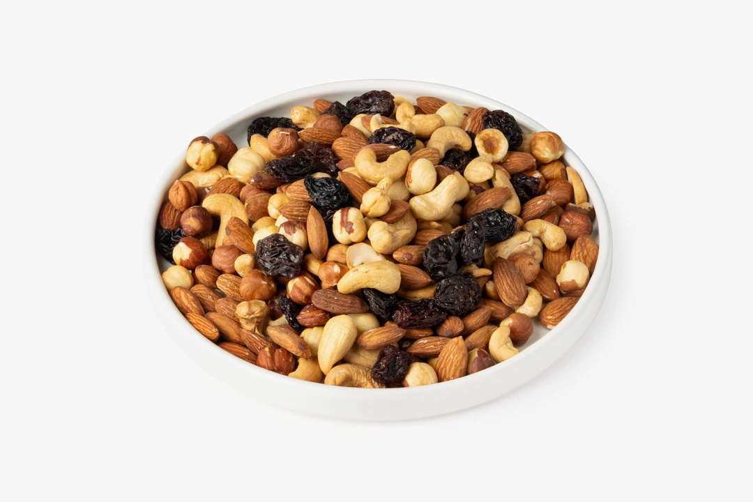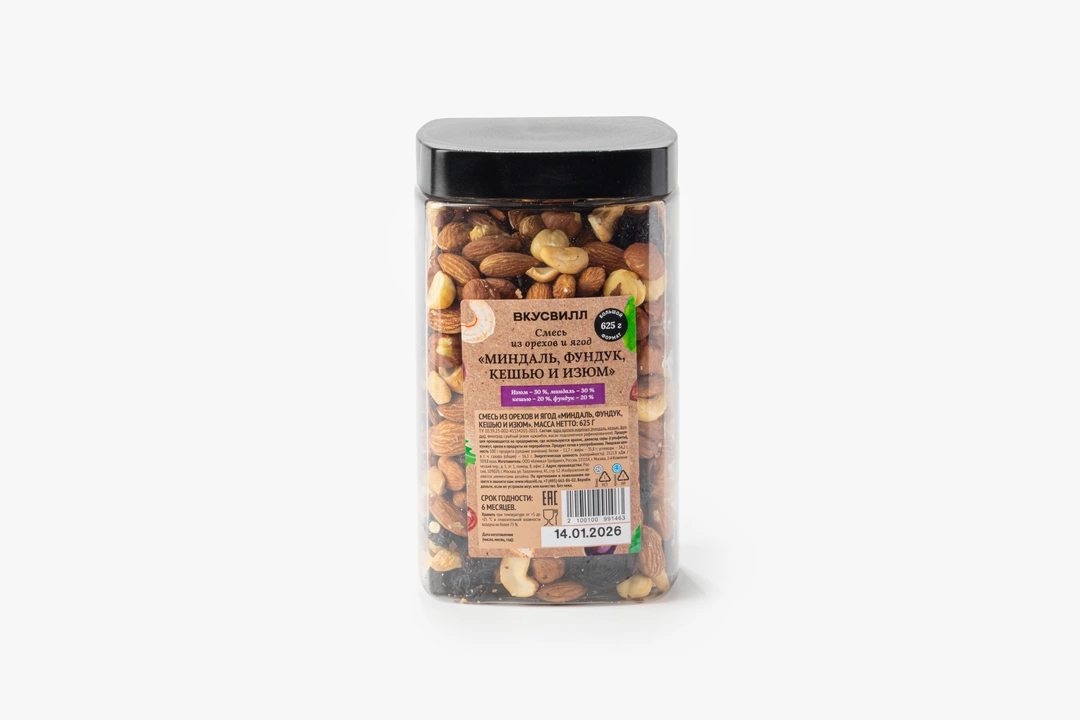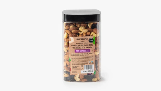 В этом фруктово-ореховом миксе объединены жареные орехи и сладкий изюм. Хрустящий миндаль, нежный кешью и фундук с его характерной лёгкой горчинкой дополнены крупными ягодами изюма. Большая упаковка 625 г подойдёт для всей семьи. А ещё её будет удобно взять для себя в офис — можно держать под рукой для натурального перекуса в течение дня.