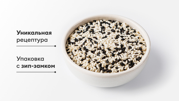 Кулинарная смесь из семян белого и черного кунжута. Смесь можно добавлять в блюда во время их приготовления или перед подачей на стол. Рекомендуется для добавления в салаты, супы, гарниры, каши, коктейли, йогурты, творог, хлеб, десерты и выпечку.