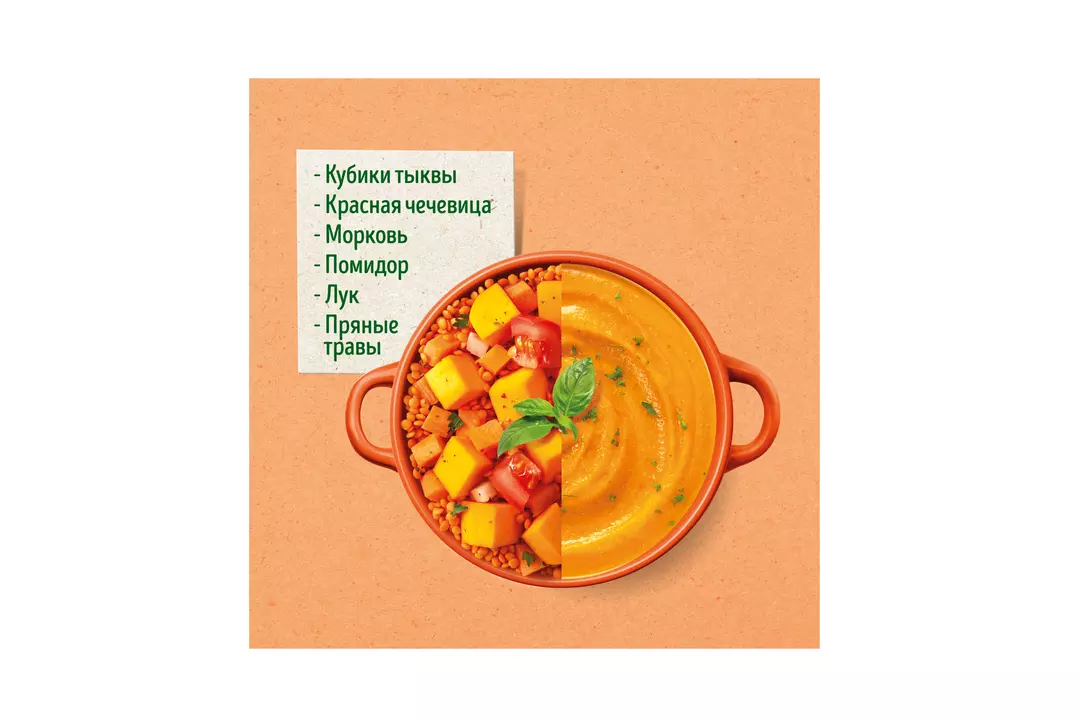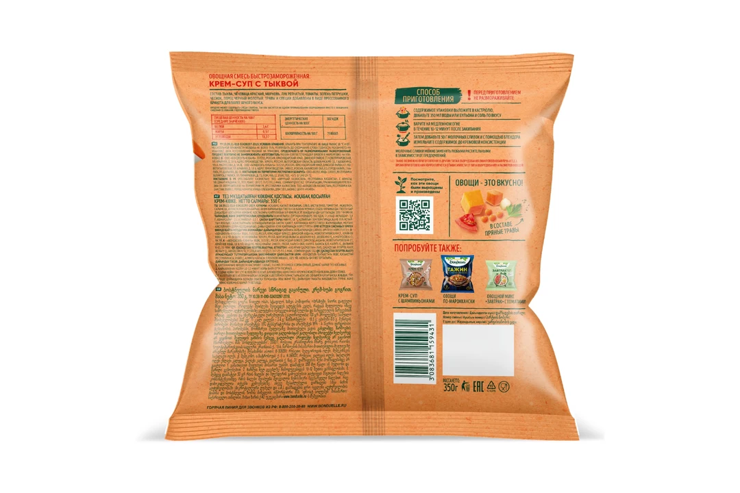 Бондюэль впервые представляет овощные крем-супы. Овощи, выращены на экологически чистых полях Черноземья, вымыты, почищены и нарезаны, а для аромата и вкуса к ним добавлены пряные травы и специи. Приготовьте любимый нежный тыквенный крем-суп, богатый витаминами и особенно редкими витаминами К и Т для лучшей усвояемости в организме всего за 12 минут на три порции для всей семьи. Страна-производитель Россия
