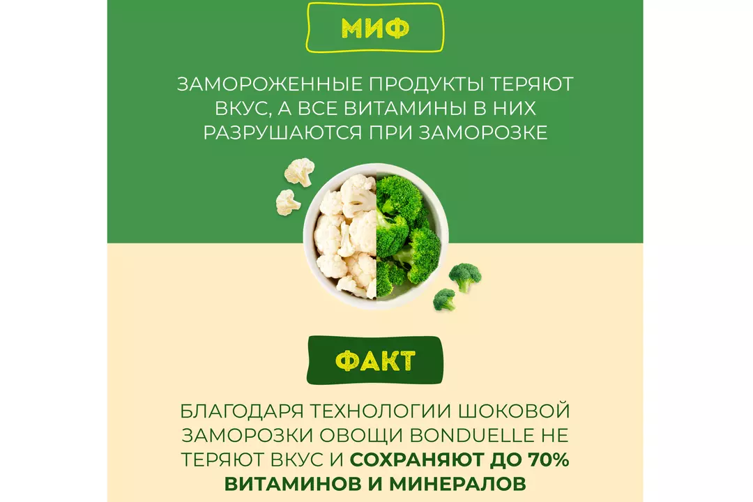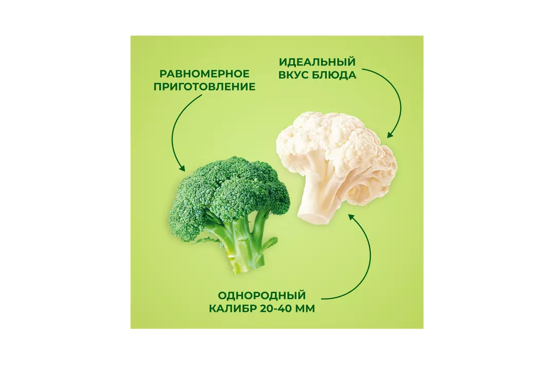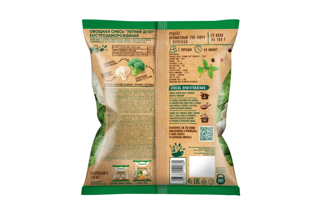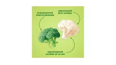 Цветная капуста и брокколи в миксе Летний дуэт от Бондюэль собраны на пике зрелости и заморожены в течение нескольких часов после сбора. Они сохранили максимум витаминов, а отборный калибр гарантирует равномерное приготовление. Добавьте качественный овощной микс в горячее блюдо, чтобы сделать свой рацион полезнее и сбалансированнее. Страна производитель-Россия