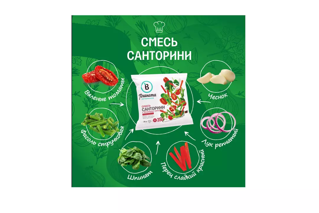Микс овощей вдохновлен средиземноморской греко - итальянской кухней. Санторини – это живописный греческий остров в Средиземном море. Создав одноименный продукт, мы стремились передать эмоции местной кухни - яркой, ароматной, насыщенной вкусами свежих овощей, зелени и пряностей. Вяленые в печи томаты в сочетании со сладким перцем дают яркий вкус. Страна-производитель Россия