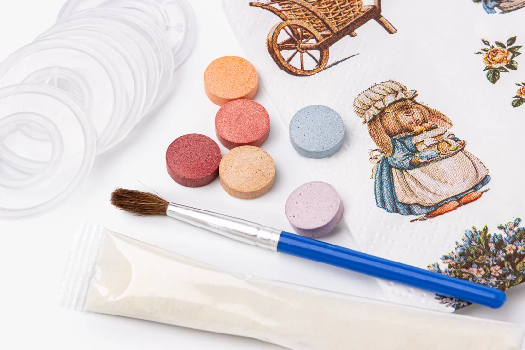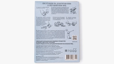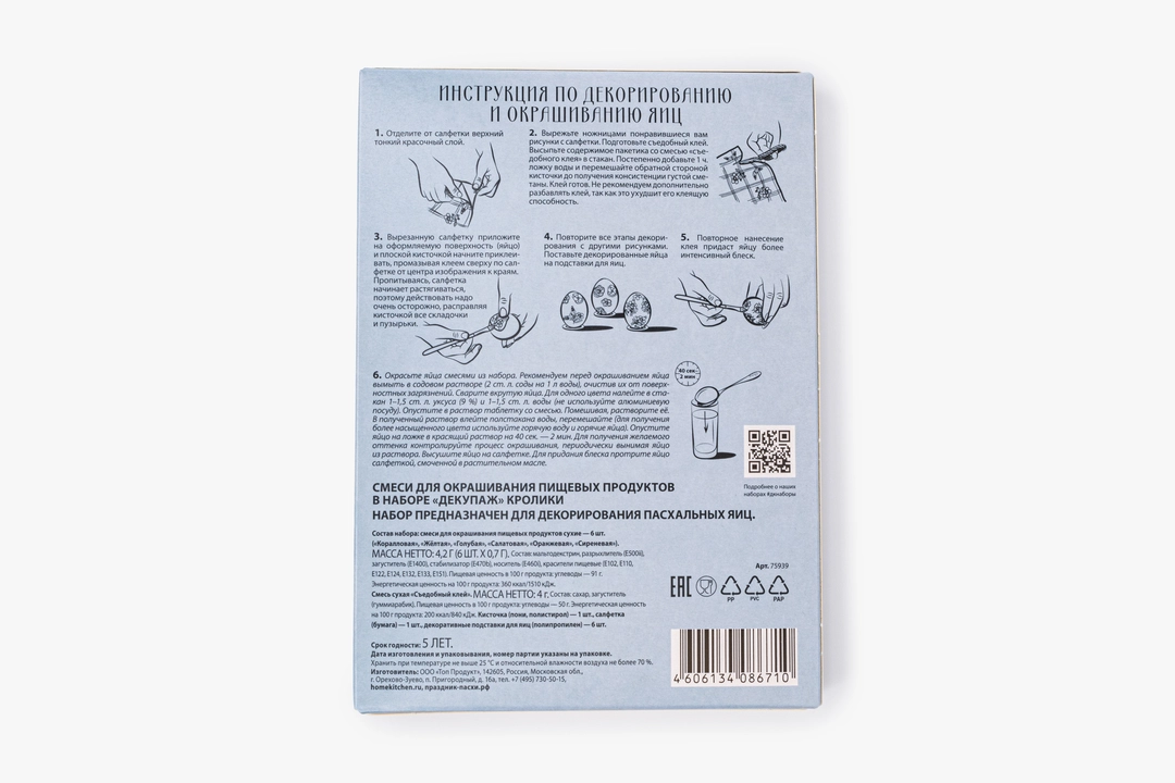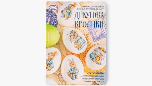 Набор для декорирования и окрашивания яиц включает 6 сухих смесей разных оттенков: коралловый, жёлтый, голубой, салатовый, оранжевый и сиреневый. В комплекте также съедобный клей, салфетка с рисунками, кисточка и 6 подставок. С его помощью можно украшать пасхальные яйца в технике декупаж или просто окрашивать их в насыщенные цвета. Все компоненты подходят для контакта с пищевыми продуктами. В наборе есть подробная инструкция, которая поможет легко и аккуратно выполнить каждый шаг.
