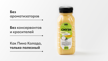 Сочный смузи со вкусом тропических фруктов. Изготовлен на основе ананасового сока, мякоти кокоса и пюре манго с добавлением фруктозы. По вкусу напиток напоминает безалкогольную Пина Коладу. Он не только подойдёт для завтрака, но и станет полноценным полезным перекусом.