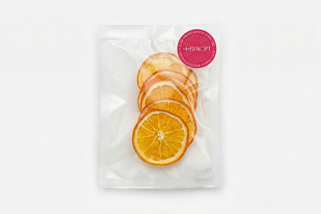 Апельсины тонко нарезаем на слайсере, чтобы получались аккуратные фруктовые чипсы. Затем бережно сушим их при температуре 60 °C — так сохраняется натуральный вкус и аромат цитруса. Получается лёгкий фруктовый снек с яркой цитрусовой ноткой без добавленного сахара. Фруткорт — это наша собственная кухня, где мы сами готовим свежие нарезки и напитки в течение дня. Больше информации и другие позиции можно найти в каталоге по слову «фруткорт».