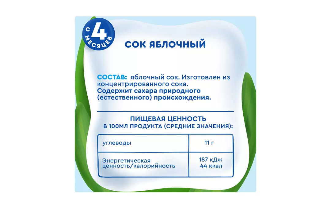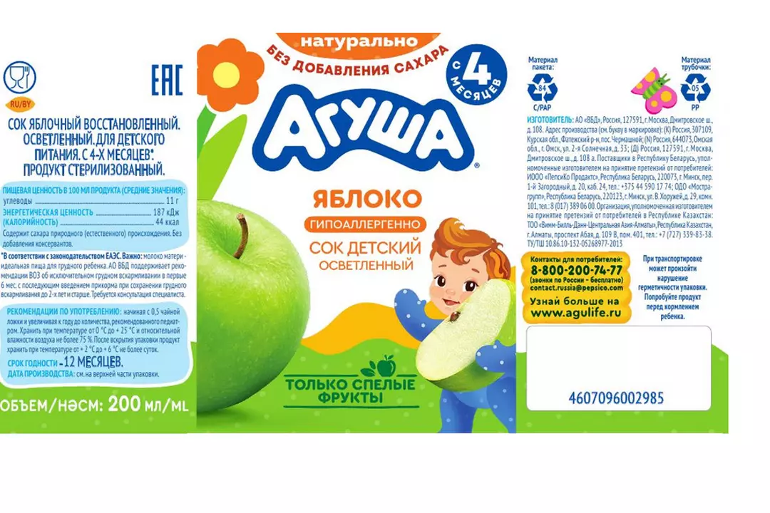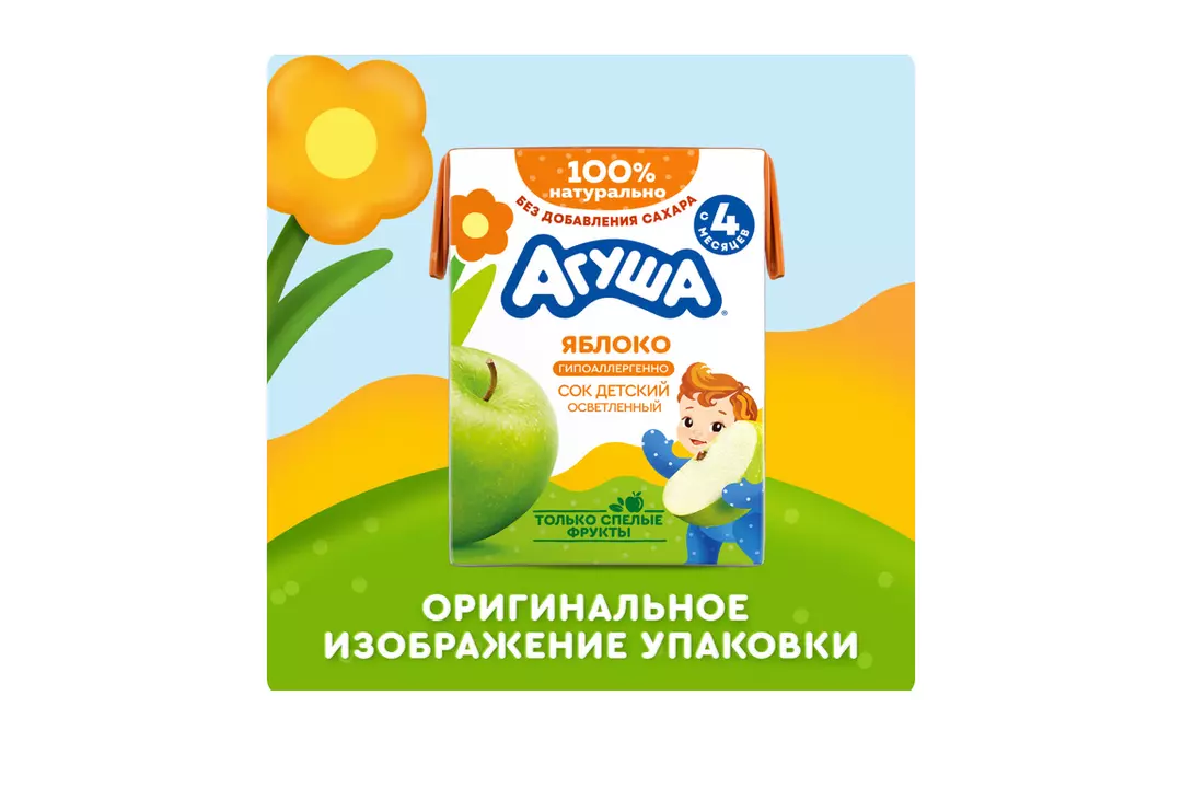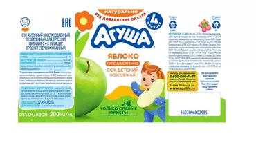 Сок Агуша для самых маленьких ●Без добавления сахара, консервантов и красителей ●Спелое яблоко ●Предусматривает 72 проверки качества продукта – от сбора фруктов, производства, упаковки до доставки в магазин ●Гипоаллергенность клинически доказана Детское питание под брендом “Агуша” уже много лет производится на территории Лианозовского молочного комбината. Там в далеком 1982 году был открыт завод детских молочных продуктов, и уже более 30 лет предприятие является официальным поставщиком детского питания на молочные кухни Москвы. Также были открыты новые современные заводы в Поволжье (г.Нижний Новгород), на Юге (г.Тимашевск) и в Сибири (г.Омск). Страна-производитель: Russian Federation Возраст потребления: с 4 месяцев