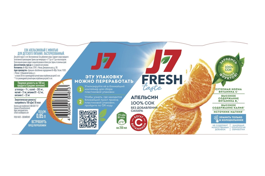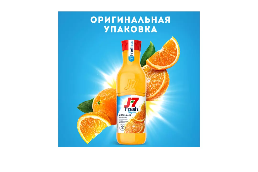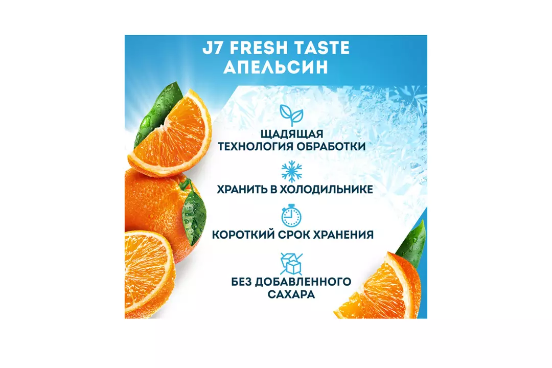 Апельсиновый сок холодного хранения J7 Fresh Taste – это 100% сок без добавления сахара, который произведен с использованием щадящей технологии обработки и сохранил в себе витамины и свежий вкус спелых апельсинов. Охлажденный 100% апельсиновый сок J7 Fresh Taste – зарядись энергией вкусных фруктов! • 100% апельсиновый сок J7 Fresh Taste без добавления сахара, консервантов и красителей • Суточная норма витамина С в каждом стакане* • Высокое содержание витамина В1 и калия, источник магния* • Щадящая технология обработки • Короткий срок хранения • Хранить только в холодильнике *В стакане сока 250 мл от рекомендуемой суточной нормы потребления для детей 3-х лет. Страна производитель-Россия