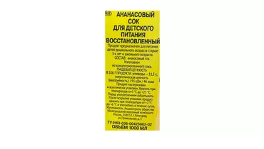 Сок Santal ананасовый 100% 1л. Изготовлен из концентрированного сока. Сок ананасовый для детского питания. Рекомендовано для употребления взрослыми и детьми с 3-х лет в организованных детских учреждениях.