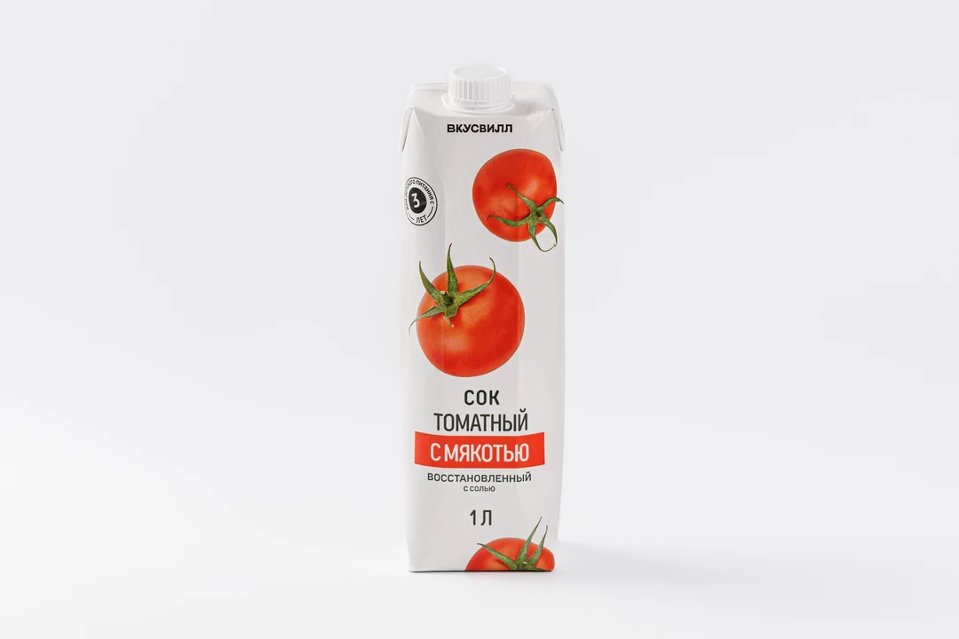 Восстановленный томатный сок с солью. У напитка насыщенный вкус, яркий аромат и густая однородная консистенция. Его можно пить в разгрузочные дни и просто для удовольствия, а также использовать в кулинарии. К тому же этот полезный напиток подходит детям от 3 лет. Объемная доля мякоти не менее 8%. Благодаря стерилизации, сок может храниться до 1 года.