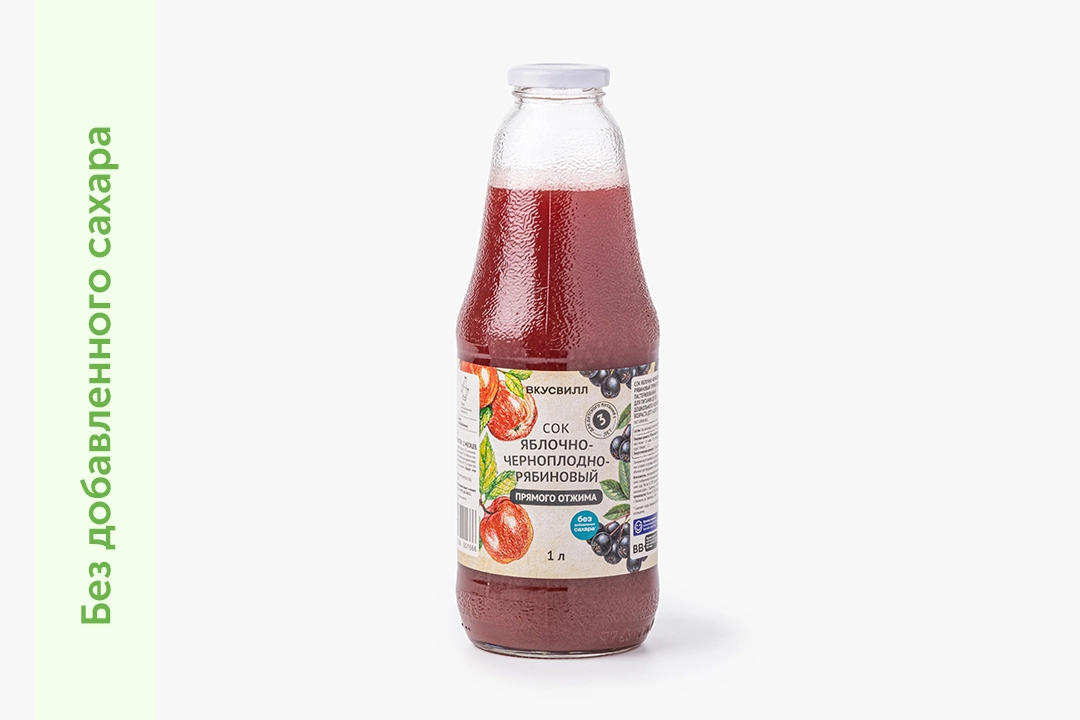 Сок прямого отжима с насыщенным вкусом спелых яблок и терпкой черноплодной рябины. В составе только натуральный сок — без добавления сахара, консервантов, искусственных ароматизаторов и красителей. Содержит сахара природного происхождения. Возможен естественный осадок. Рекомендуем встряхнуть перед употреблением.