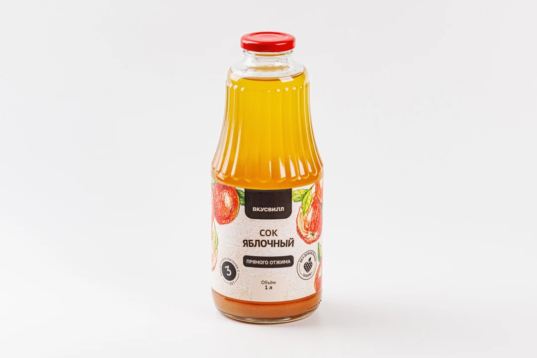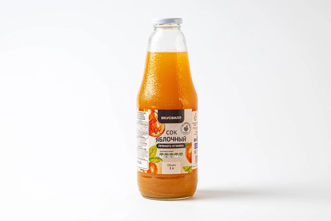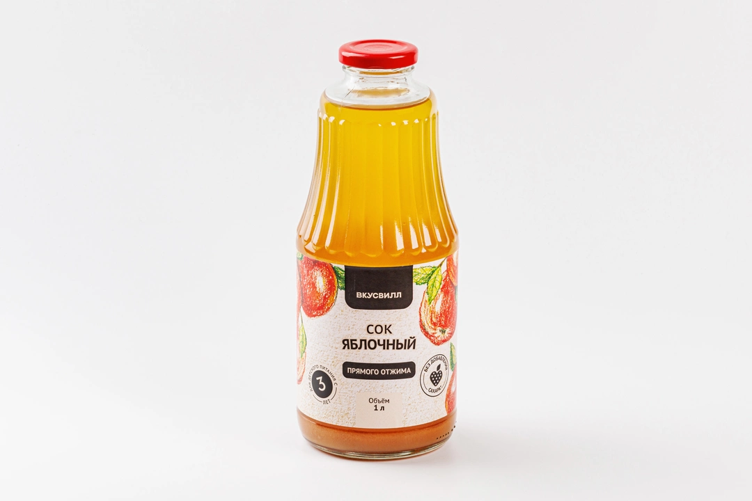 Яблочный сок прямого отжима без добавленного сахара. Сладковатый, с приятной кислинкой и ярким ароматом свежих фруктов. Сок готовят из яблок разных сортов и не осветляют. Поэтому цвет и прозрачность напитка варьирует от бутылочки к бутылочке, а на дне может быть естественный осадок.