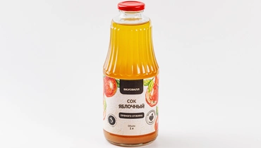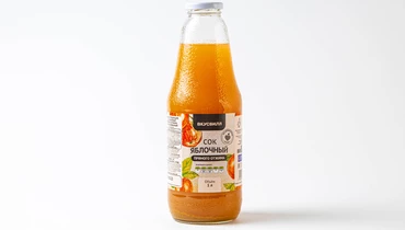 Яблочный сок прямого отжима без добавленного сахара. Сладковатый, с приятной кислинкой и ярким ароматом свежих фруктов. Сок готовят из яблок разных сортов и не осветляют. Поэтому цвет и прозрачность напитка варьирует от бутылочки к бутылочке, а на дне может быть естественный осадок.